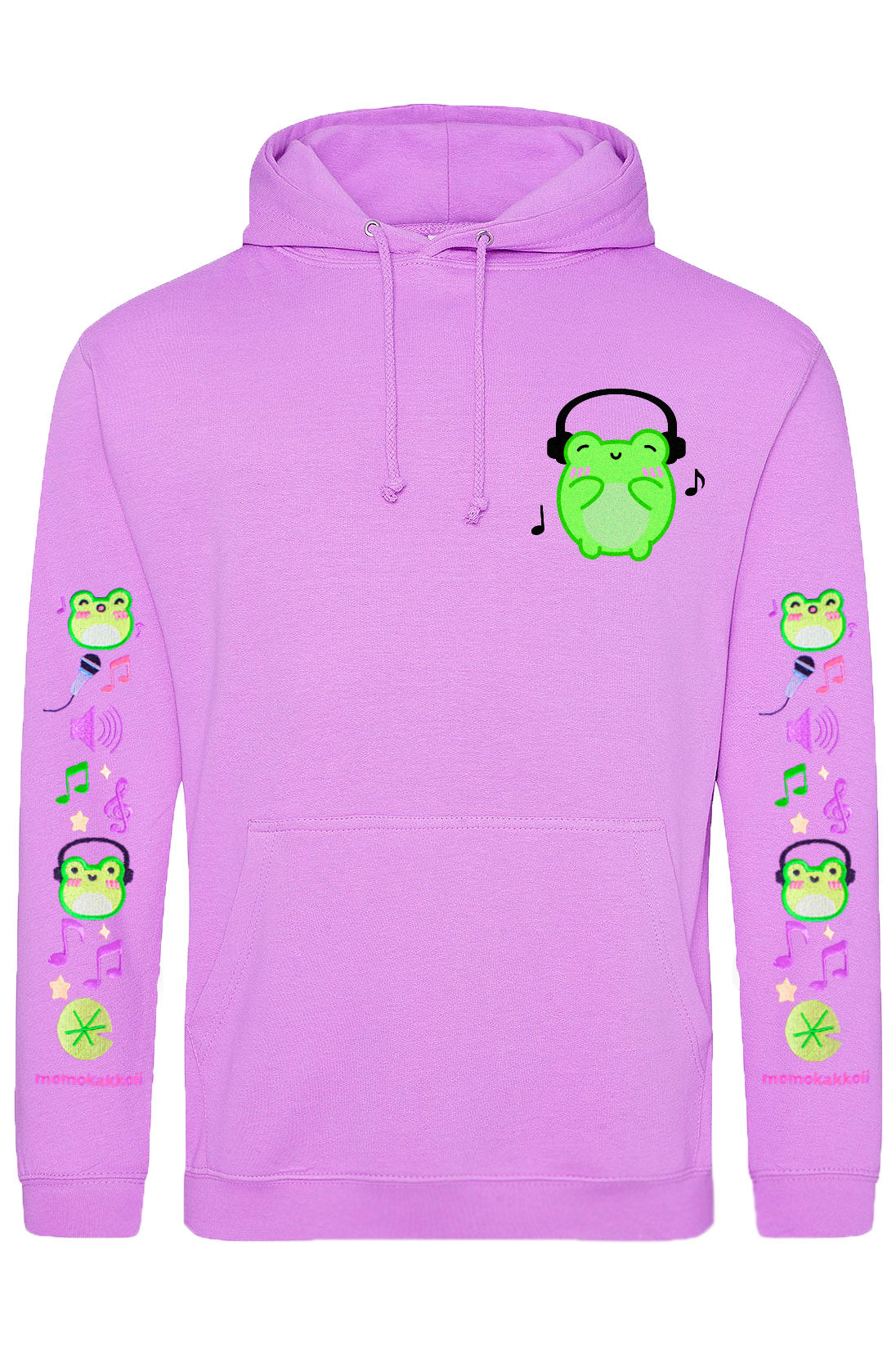 Crafted from the softest fabric in a dreamy light purple shade, this hoodie is the perfect blend of cute and cozy. Adorned with charming embroidered details of Albert the Frog enjoying his tunes, it's a delightful expression of your unique style. Whether you’re lounging or out on a casual adventure, this hoodie is designed to keep you comfy and chic.