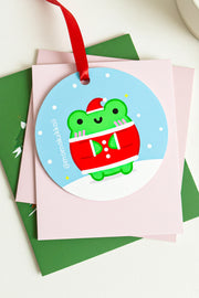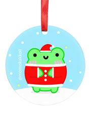 Printed on a glossy round MDF base, this lightweight ornament is perfect for those who like their holiday décor cute, weird, and full of frog energy. Hang him on your tree, your wall, your bag… we won’t judge.
