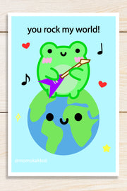 Albert the Frog is ready to shred, and he’s doing it just for you. The "You Rock My World" art print features Albert in his full rockstar moment, tiny guitar in hand, pouring his little froggy soul into the performance of a lifetime. If frogs could headline festivals, this would be his breakout tour.