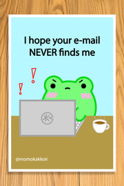Albert the Frog has checked out… permanently. The "I Hope Your Email NEVER Finds Me" art print perfectly captures the universal struggle of dodging work responsibilities with just the right amount of froggy panic.