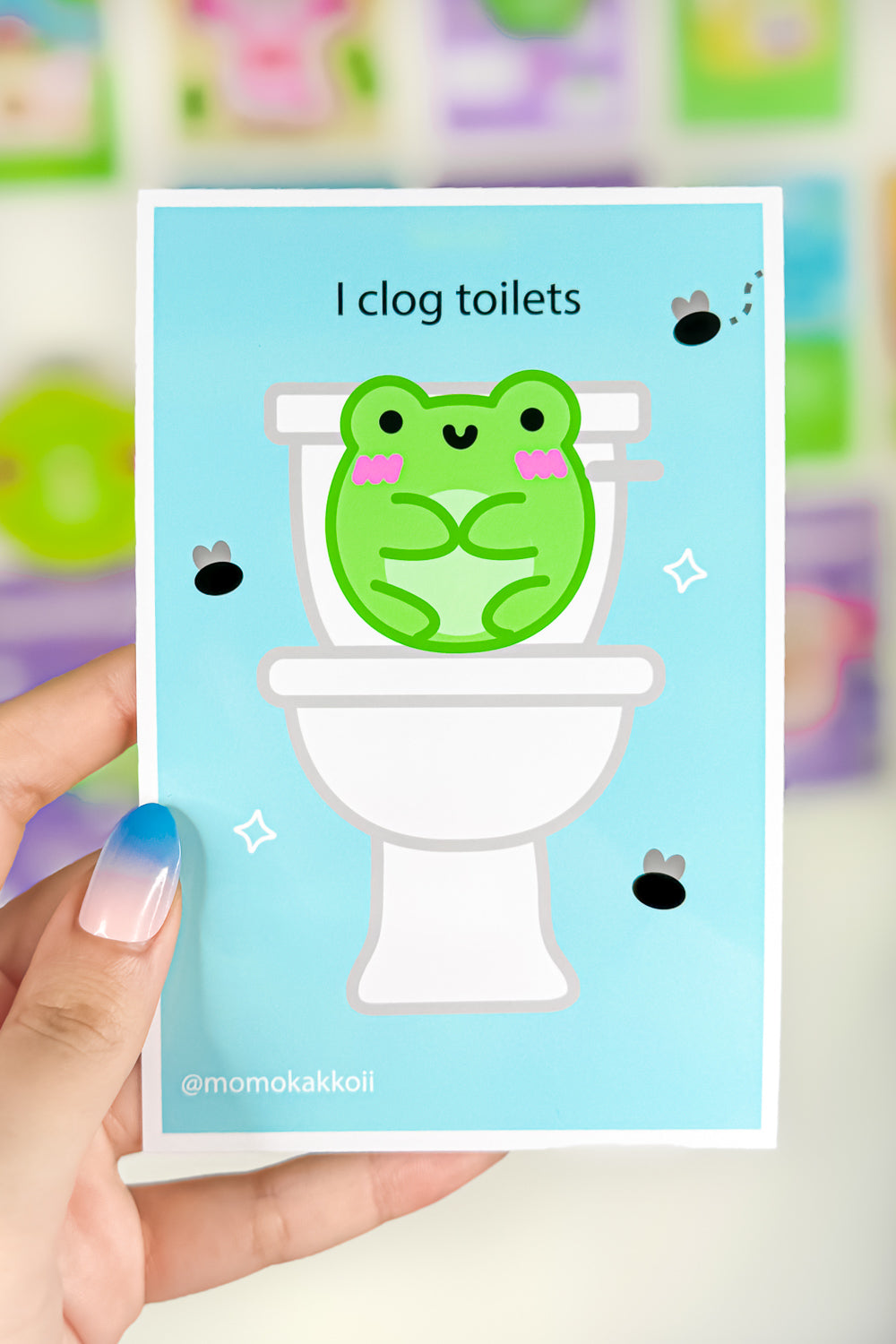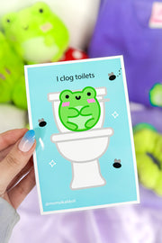 This lighthearted piece features Albert the Frog in a humorous scenario, claiming his throne atop a toilet with a mischievous expression that suggests he's up to some bathroom hijinks.