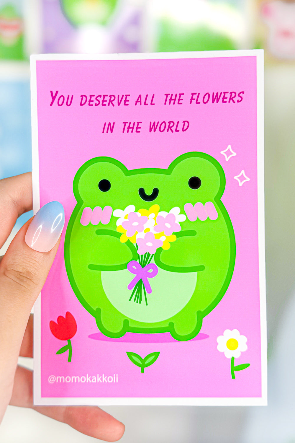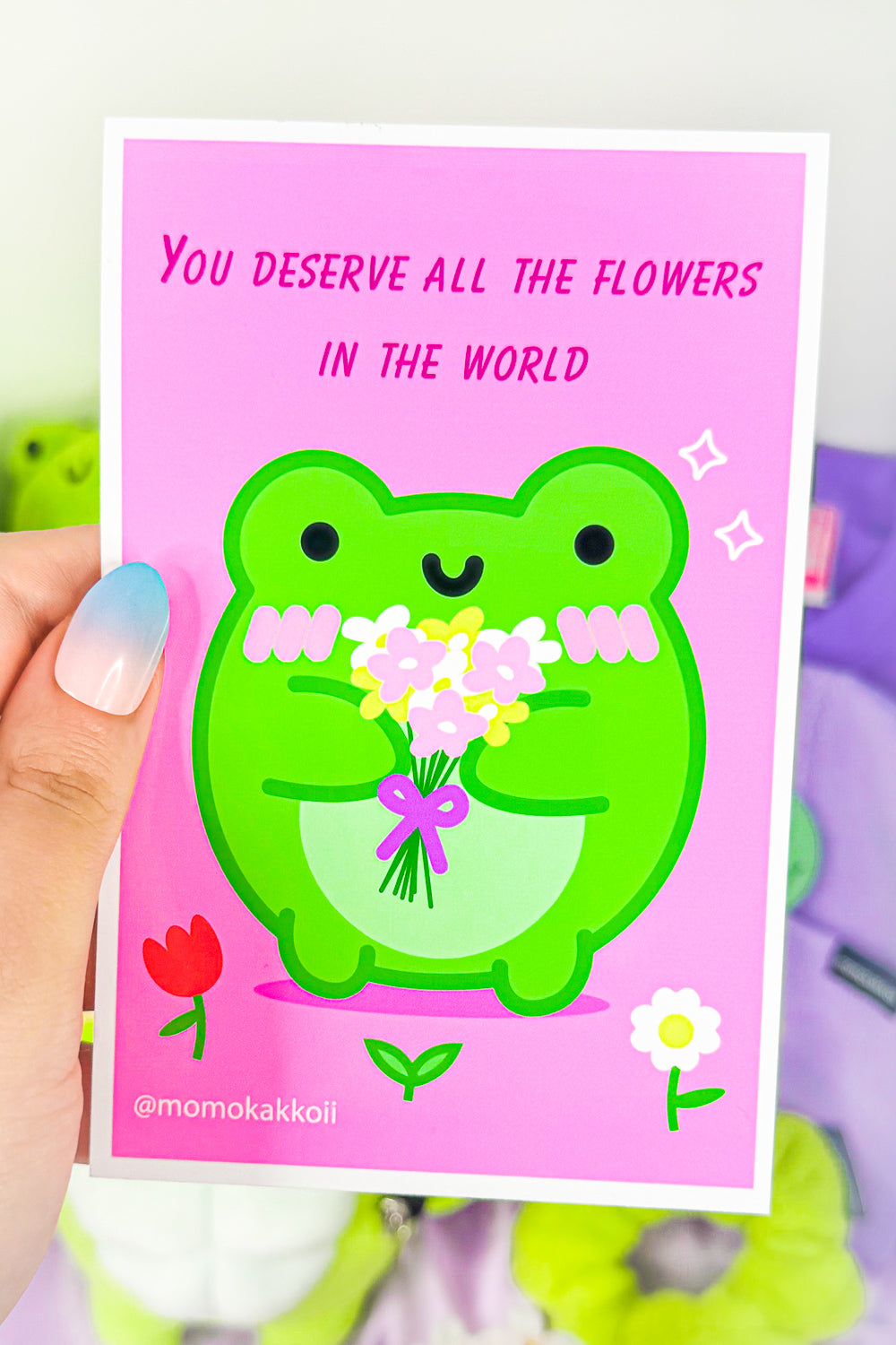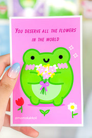 This delightful piece features Albert the Frog, a character that exudes happiness and generosity, holding a colorful bouquet of flowers just for you. Designed to bring a smile to your face, this print is perfect for anyone who needs a little pick-me-up or a reminder of their worth.