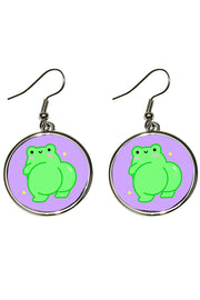 The BBL Albert Drop Earrings put Albert the Frog exactly where he was always destined to be, suspended from your ears, framed in a silver circle, set against a lilac background, flanked by yellow sparkles, looking absolutely serene about the whole situation. He is not swinging. He is presiding.