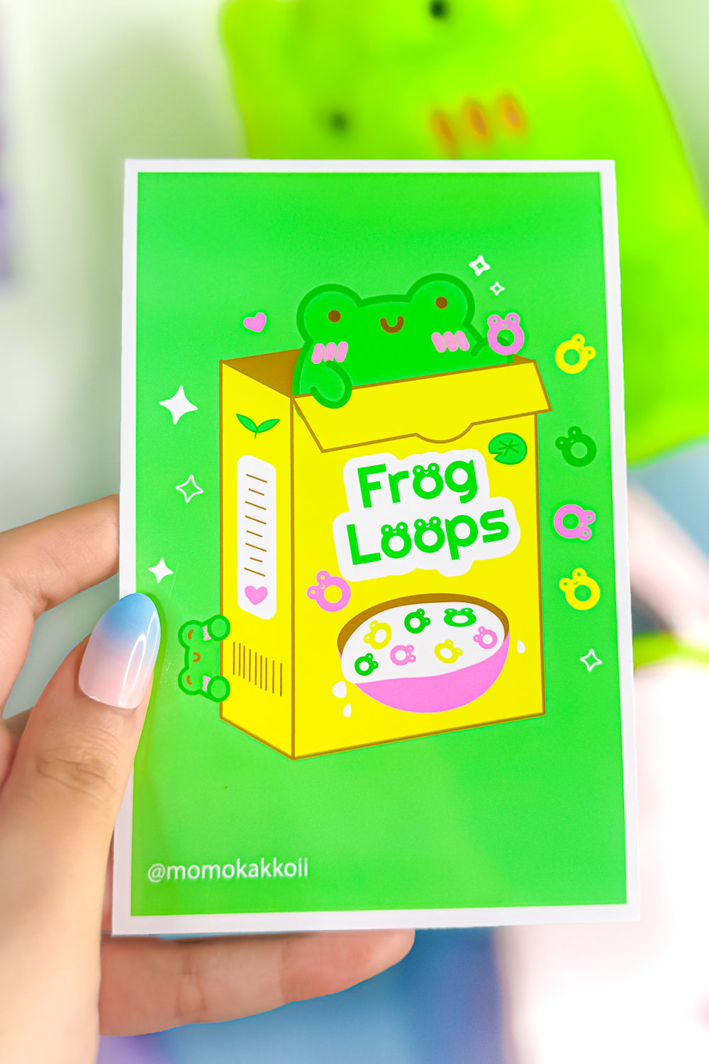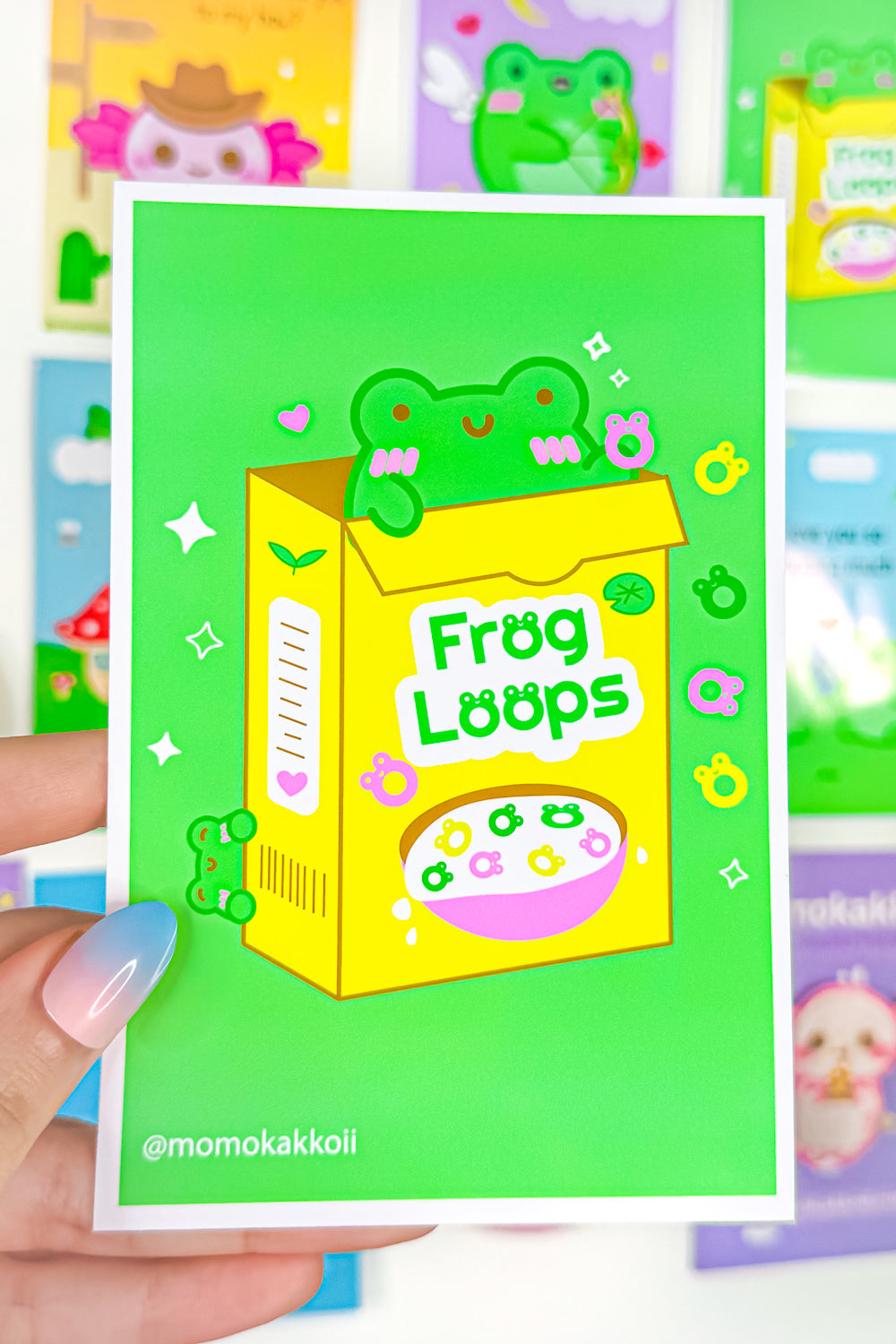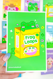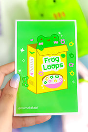 Leap into a world of fun with our "Albert Frog Loops Art Print"! This whimsically delightful illustration brings a burst of playfulness to any room with its bright, lively colors and a cheeky nod to a breakfast classic. Albert, our lovable green frog, peeks out from a vibrantly illustrated cereal box, offering a spoonful of smiles and good vibes.