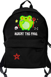 Step into a world of dark charm with the "Underworld Albert Embroidered Backpack." Crafted with the spirit of the edgy and the enchanting, this backpack features Albert the Frog as the ruler of the underworld, complete with a wickedly cute trident and glowing eyes. The vibrant green embroidery pops against the sleek black fabric, surrounded by whimsical accents like a tiny skull and shimmering stars.