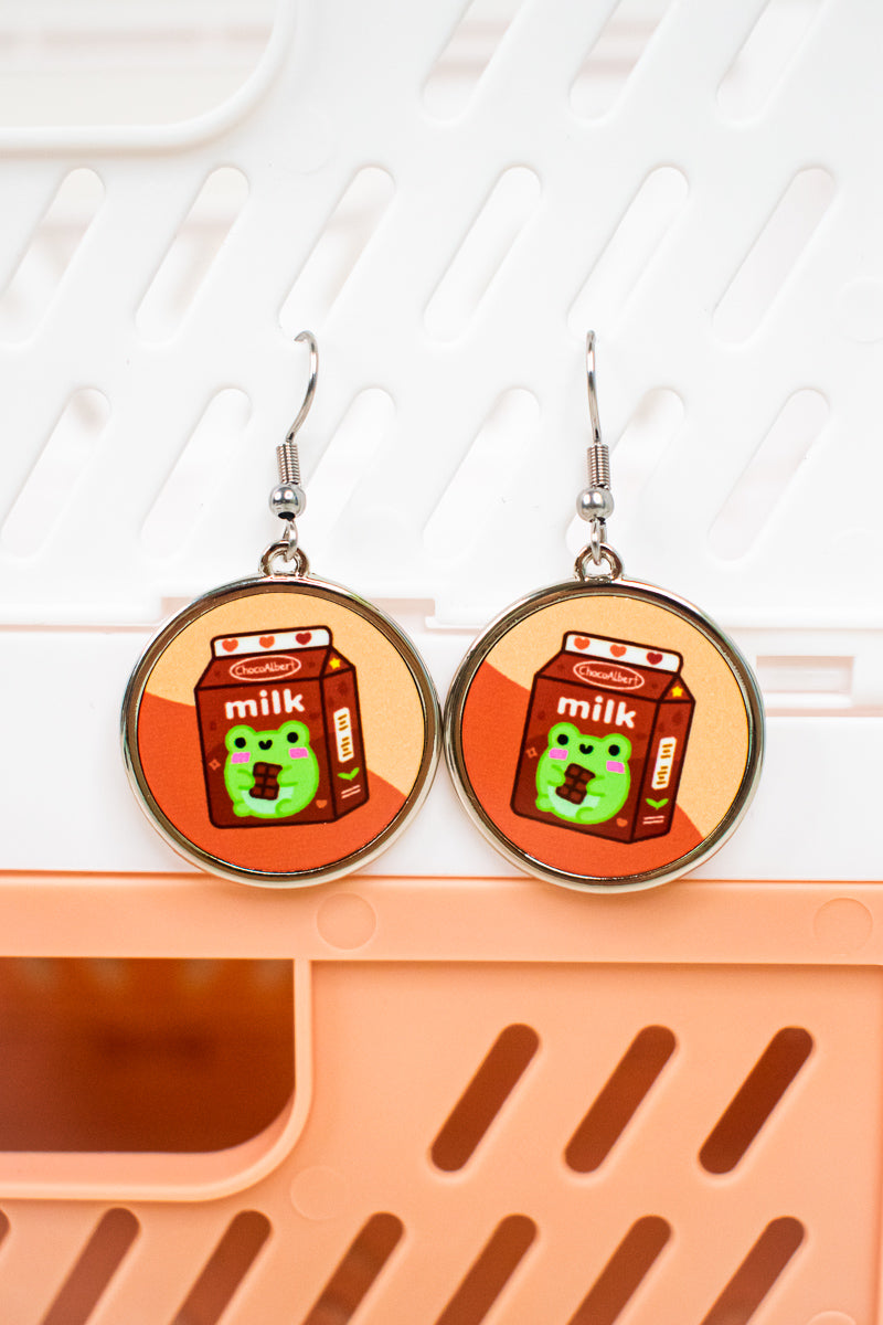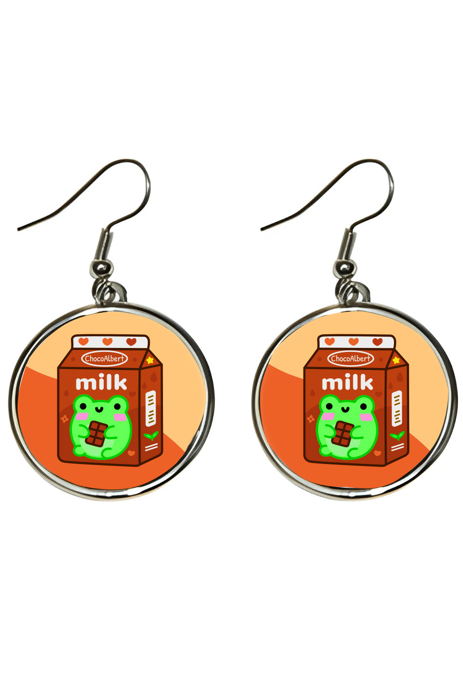 Each earring features Albert peeking from a carton of chocolate milk, with soft blush cheeks and his signature cheeky smile. Printed on lightweight, round metal discs, these won’t weigh you down, even if your style is heavy on the frogcore.