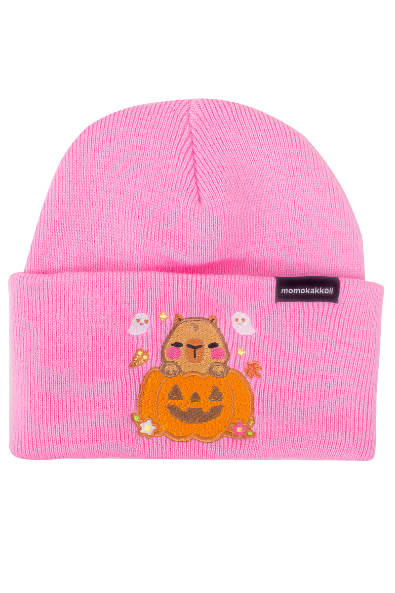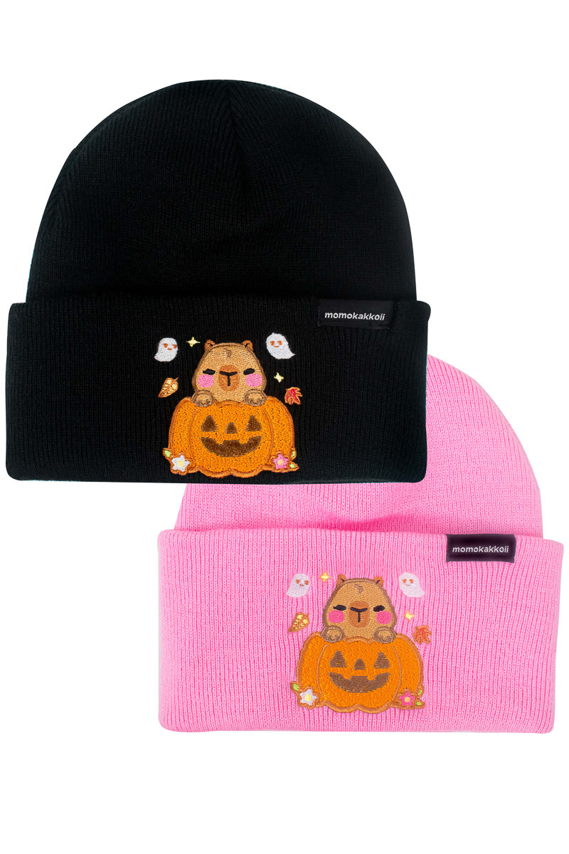 Spooky season just got a glow-up. Introducing Pumpkin Theo the Capybara, your new favorite fall companion, now embroidered on the coziest beanie ever in two iconic colors: pastel pink for the cuties, and black for the goth ghouls