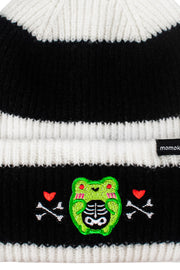 This striped beanie features our beloved frog icon showing off his bones, surrounded by lil’ hearts and crossbones because he’s both spooky AND full of love.