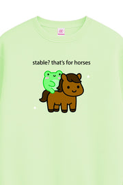 Our Stable Albert sweatshirt features Albert the Frog, emotionally clinging to a cartoon horse like your last shred of sanity. With the quote “stable? that’s for horses” printed above their heads, this cozy jumper is the literal definition of unhinged-but-make-it-cute.