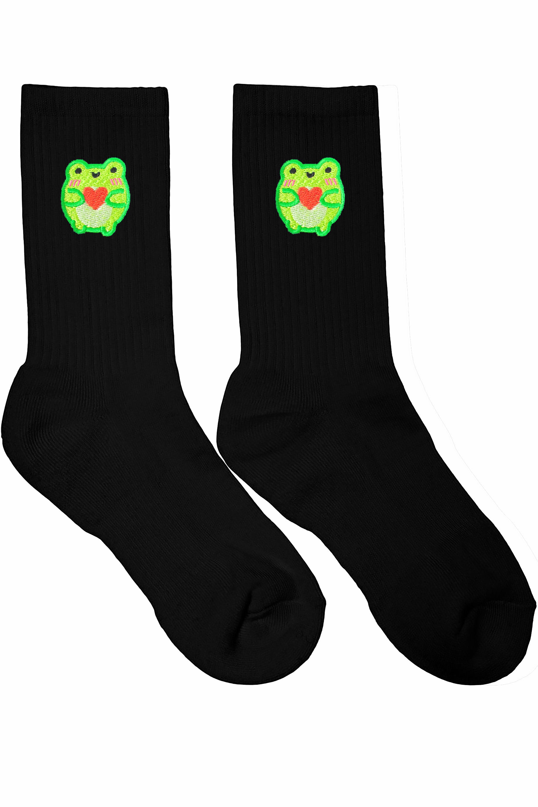 Hop into comfort with our "Heart Albert Embroidered Socks"! Featuring Albert the Frog clutching a sweet little heart, these socks are bound to bring a skip to your step and a smile to your face. Made from soft, stretchy cotton, they’re perfect for lounging around the house or stepping out in style. Whether you're a frog enthusiast or just a lover of all things cute, these socks are a must-have for adding a splash of whimsy to any outfit.
