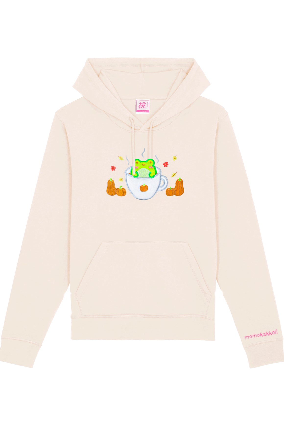 Embrace the autumn vibes with the whimsical scene of Albert the frog enjoying coffee amid the falling leaves and pumpkins. It's the perfect hoodie to cherish your love for pumpkin spice latte season while staying warm and stylish.