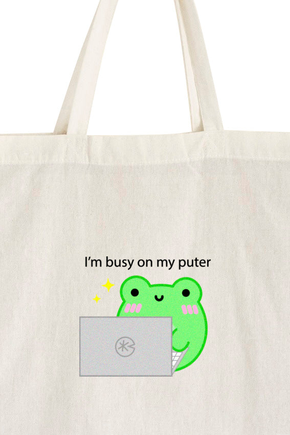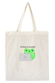 Meet your new favorite sidekick for all your daily errands: the "I'm Busy on My Puter" Tote Bag! Perfect for those who carry their world with them, this tote features the lovable Albert the Frog, engrossed in his 'puter activities. It's a charming blend of humor and practicality, ideal for shopping trips, library visits, or just a casual day out.