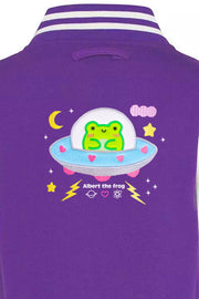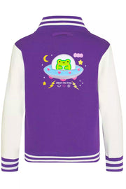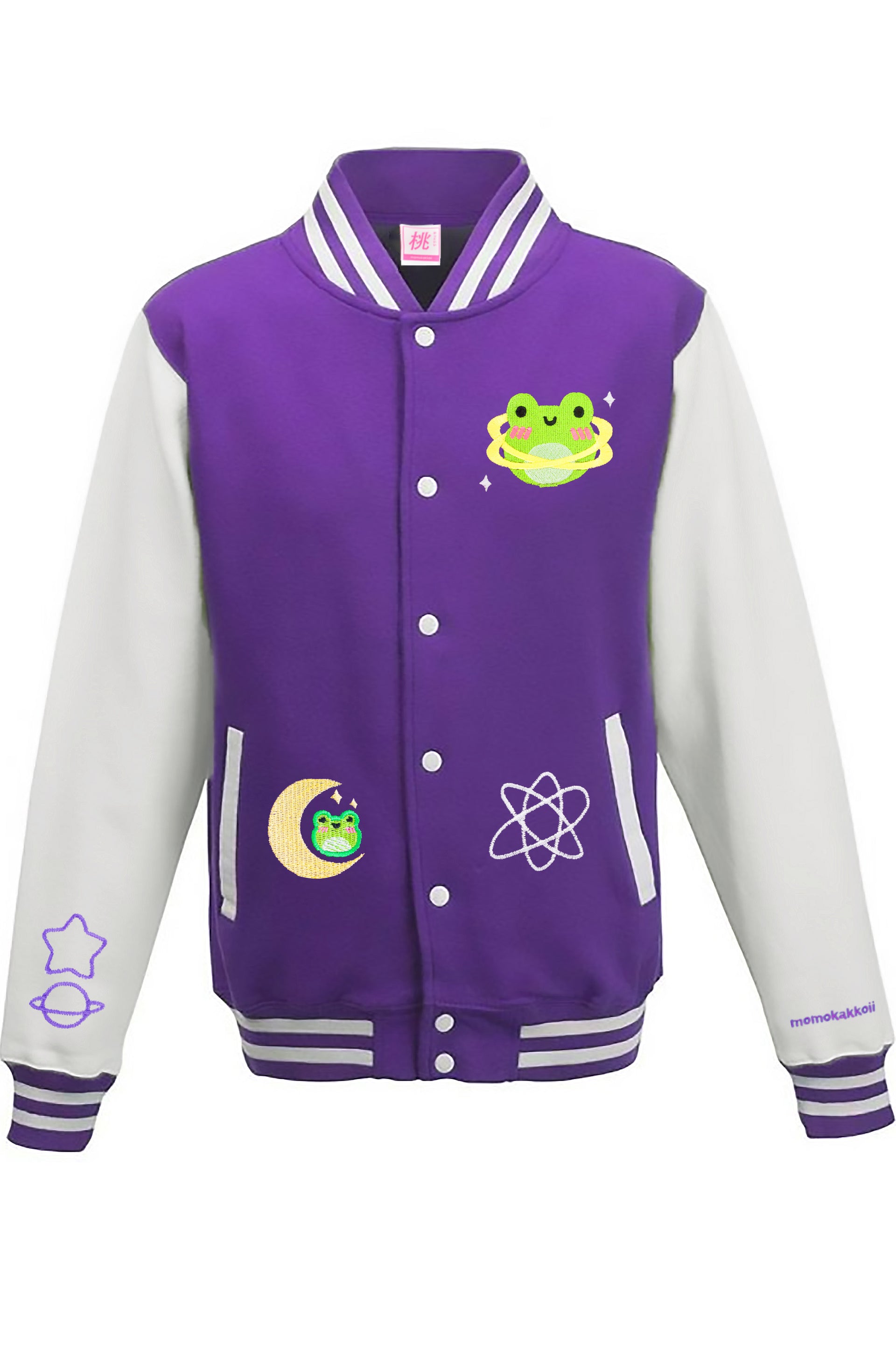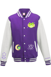 Albert the Frog has donned his spacesuit and is ready to lead you on an interstellar fashion journey. Embroidered with cosmic charm and interplanetary flair, this varsity jacket is your ticket to a universe where style and comfort collide.