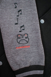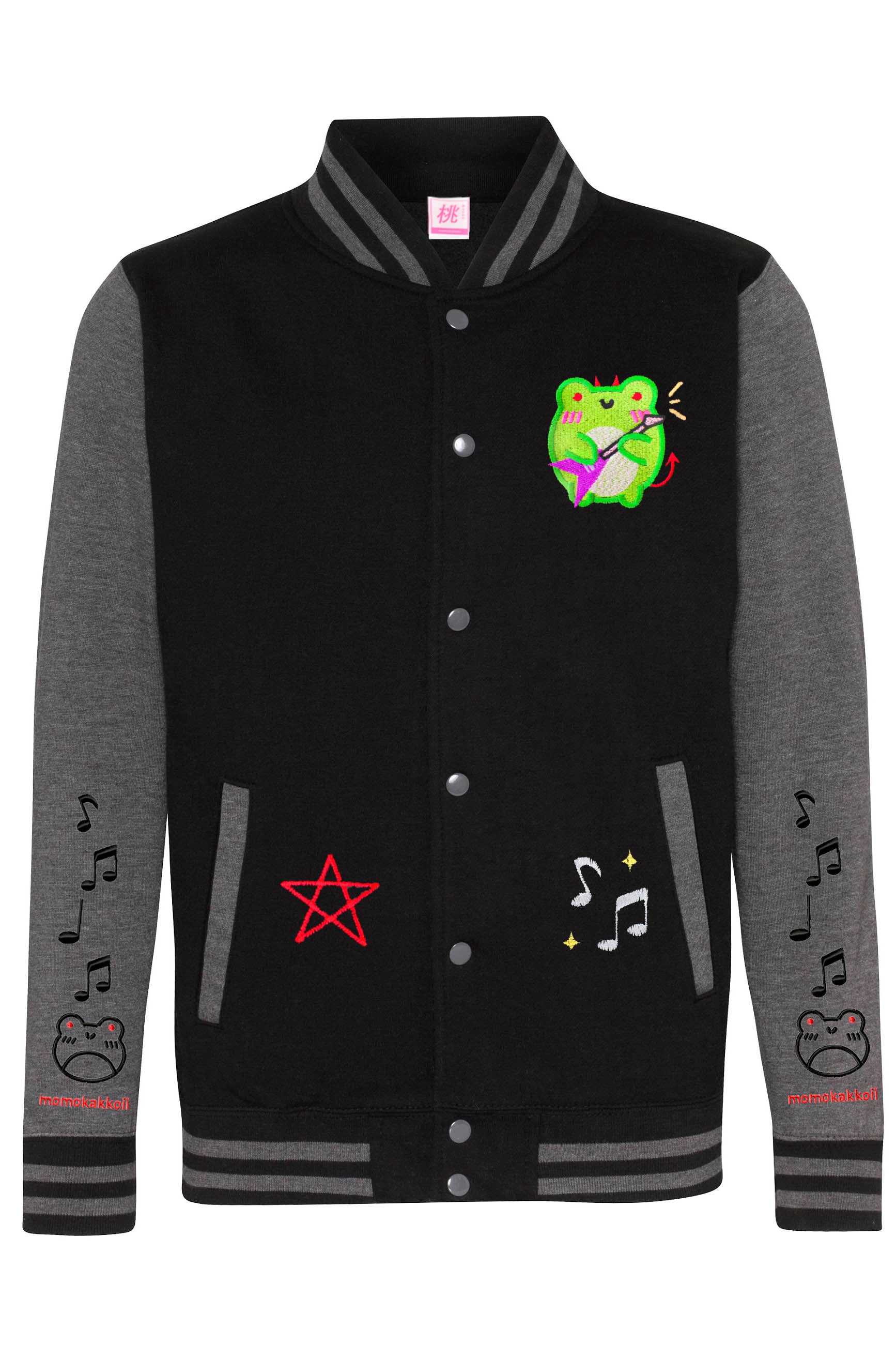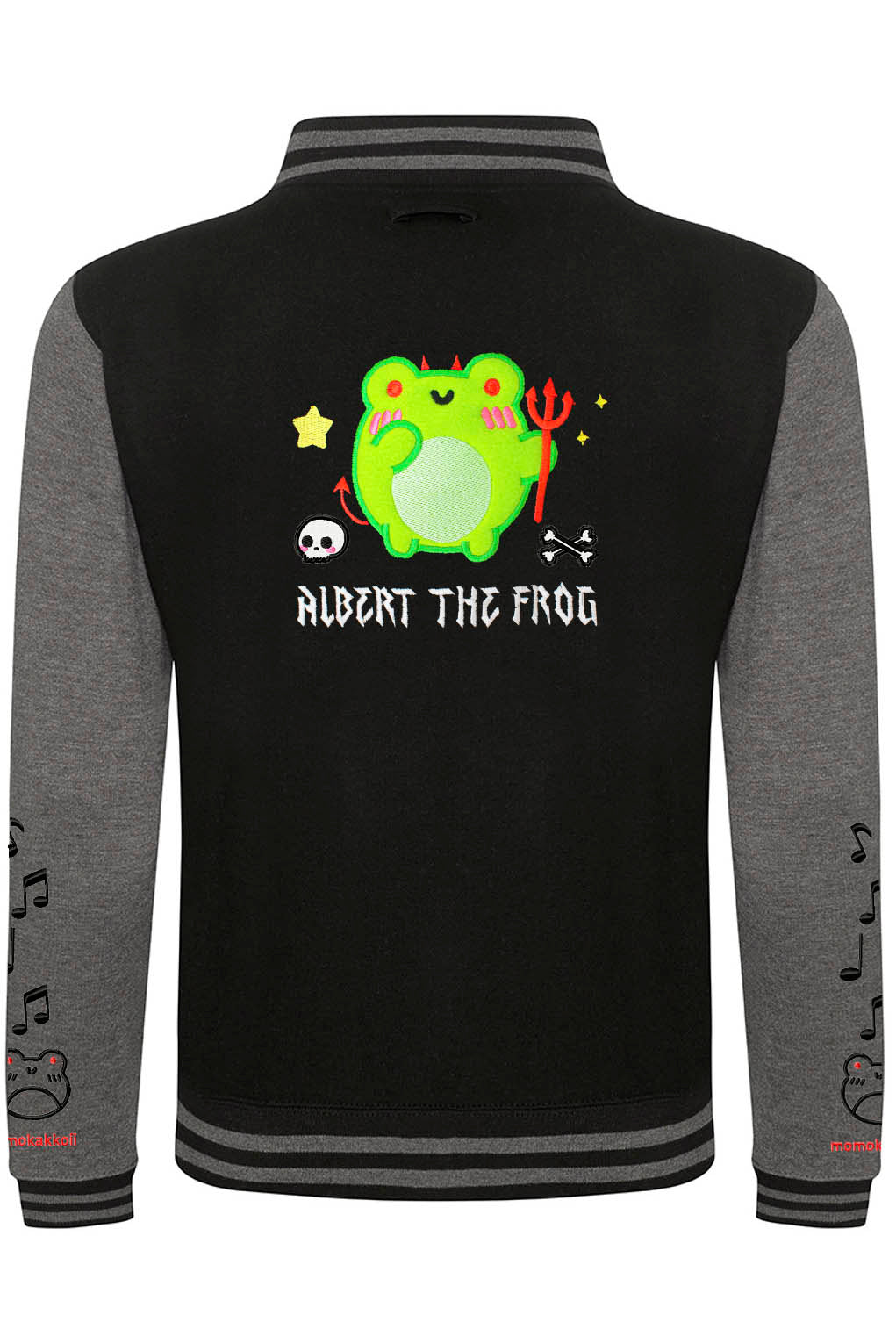 The jacket features a striking embroidered design of Albert the Frog, his vibrant green form is accented with a fiery guitar, amidst musical notes and stars that hint at the energy of a live metal concert.