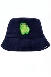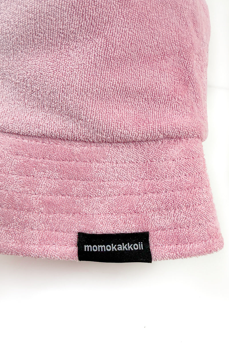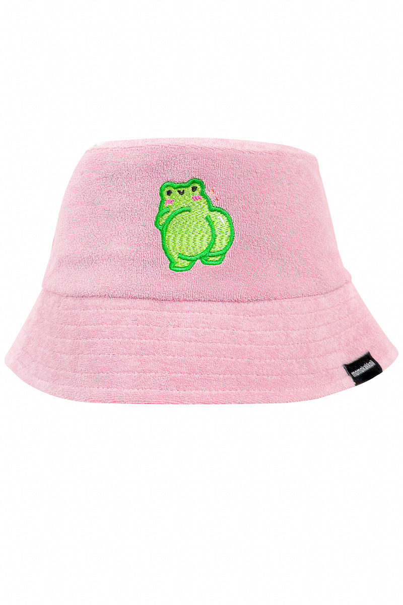 This is the BBL Albert the Frog Embroidered Bucket Hat, pink terry cloth, soft organic cotton construction, and an embroidered Albert patch that is frankly quite detailed for a creature with no ambitions. Chunky stitching. Thick outlines. Small rosy cheeks. He is, as always, staring directly into your soul and thinking about nuggets.