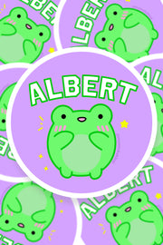 Albert the Frog comes to life in vibrant purple, radiating happiness in this adorable design. His name "ALBERT" adds a personalized touch, making the sticker uniquely charming.